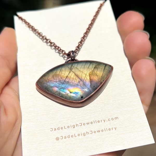 Each pendant is carefully hand forged from copper sheet. The shape is hand sawn, stone setting soldered into place, filed and sanded, coated with a patina and finally set with a labradorite stone. The pendant is then hung on a copper coated brass rolo chain.