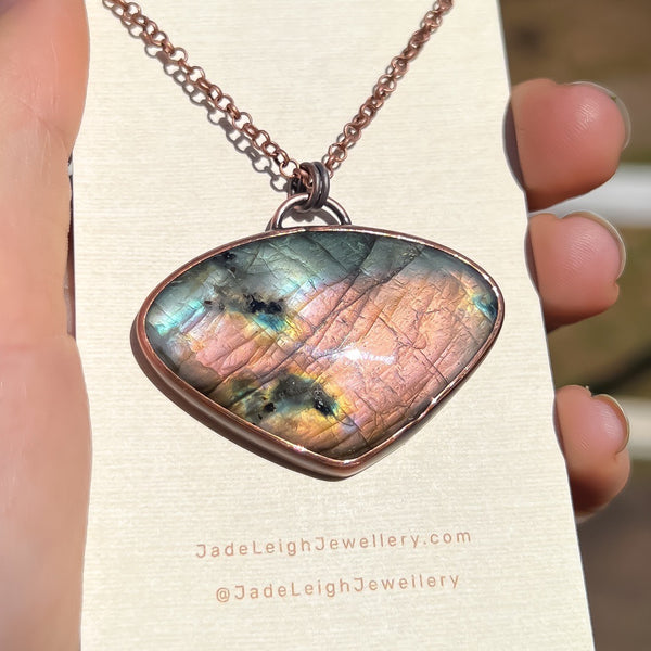 Each pendant is lovingly hand forged from copper sheet over many hours. The shape is hand sawn, stone setting soldered into place, filed and sanded, coated with a patina and finally set with a labradorite stone. The pendant is then hung on a copper coated brass rolo chain.
