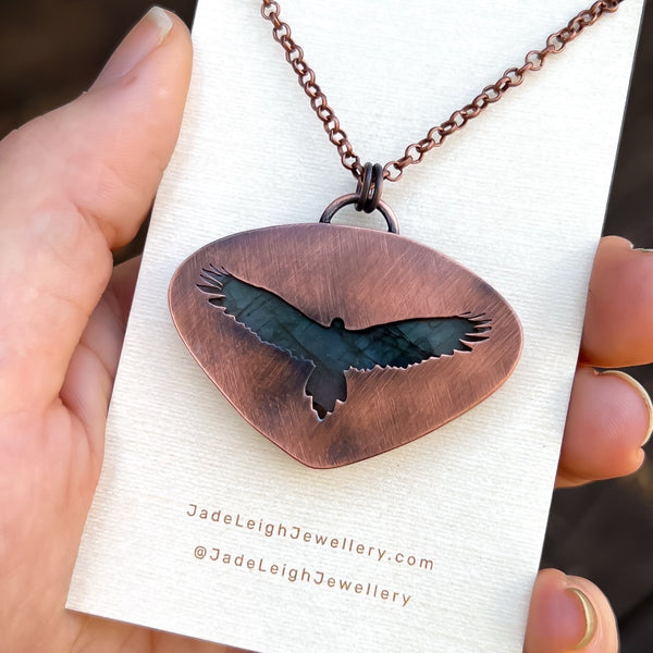 Copper and labradorite necklace with wedge tailed eagle detail.