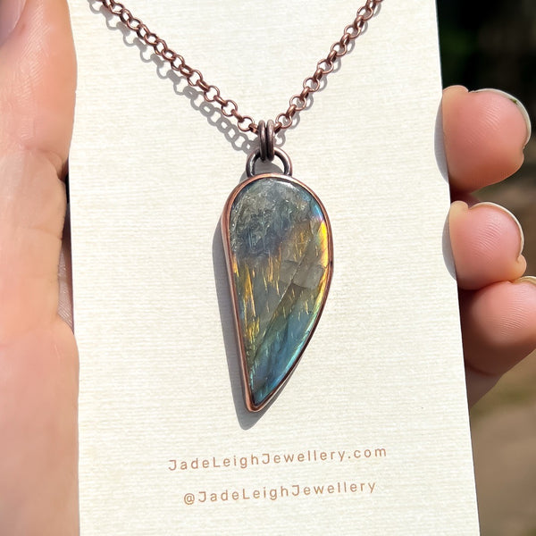 Each pendant is carefully hand forged from copper sheet. The shape is hand sawn, stone setting soldered into place, filed and sanded, coated with a patina and finally set with a labradorite stone. The pendant is then hung on a copper coated brass rolo chain.