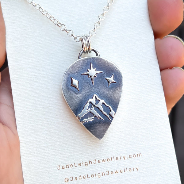 On the reverse are hand sawn and textured mountains beneath three moonstone stars.