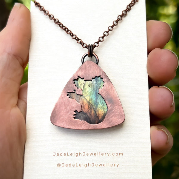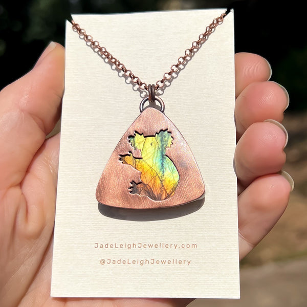 Each pendant is carefully hand forged from copper sheet. The shape is hand sawn, stone setting soldered into place, filed and sanded, coated with a patina and finally set with a labradorite stone. The pendant is then hung on a copper coated brass rolo chain.