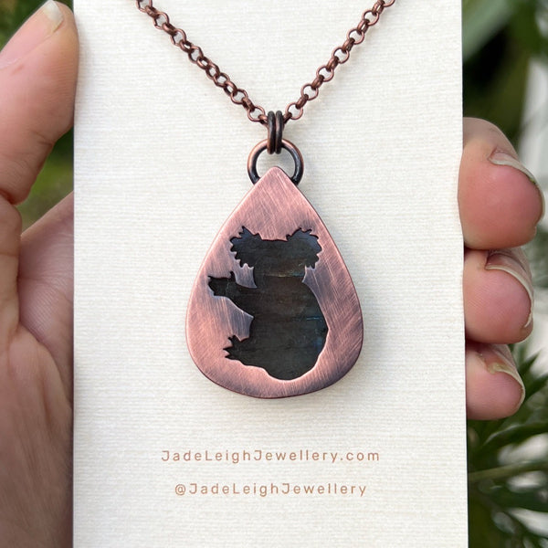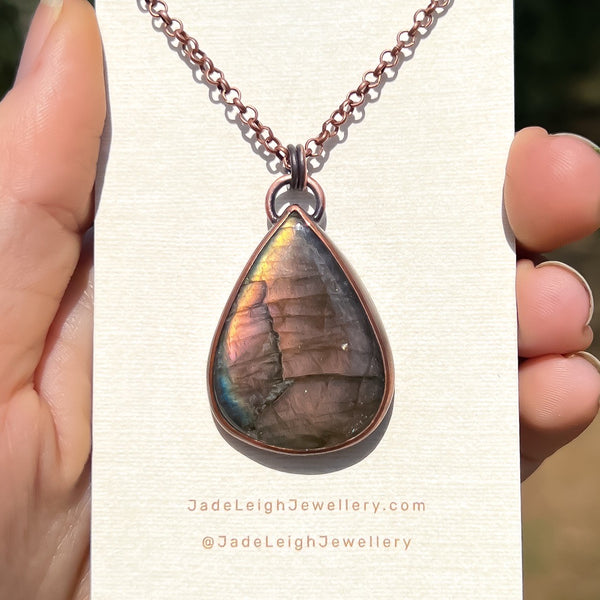Each pendant is carefully hand forged from copper sheet. The shape is hand sawn, stone setting soldered into place, filed and sanded, coated with a patina and finally set with a labradorite stone. The pendant is then hung on a copper coated brass rolo chain.
