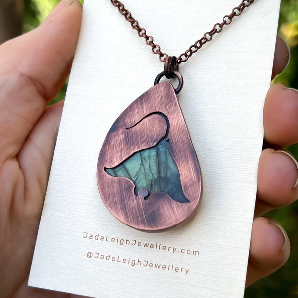 Each pendant is carefully hand forged from copper sheet. The shape is hand sawn, stone setting soldered into place, filed and sanded, coated with a patina and finally set with a labradorite stone. The pendant is then hung on a copper coated brass rolo chain.