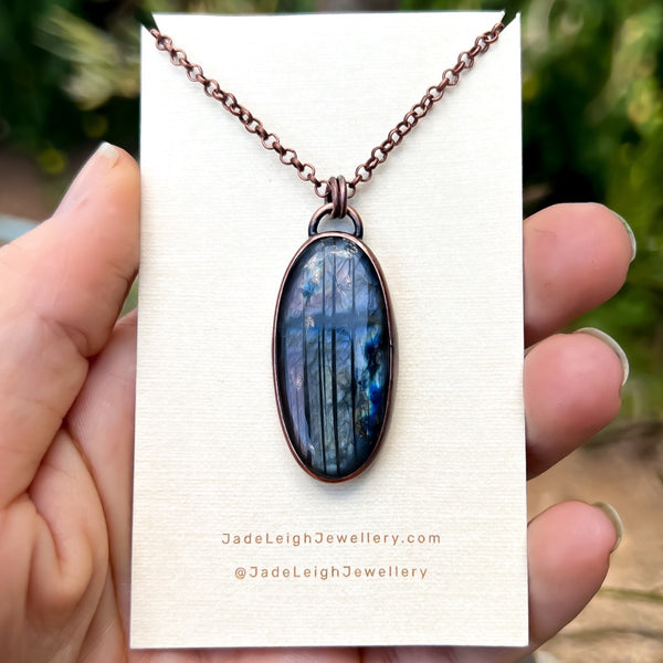 Each pendant is carefully hand forged from copper sheet. The shape is hand sawn, stone setting soldered into place, filed and sanded, coated with a patina and finally set with a labradorite stone. The pendant is then hung on a copper coated brass rolo chain.
