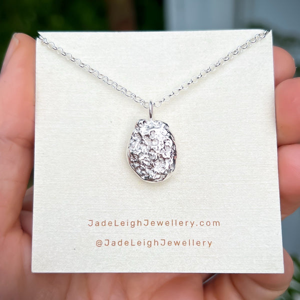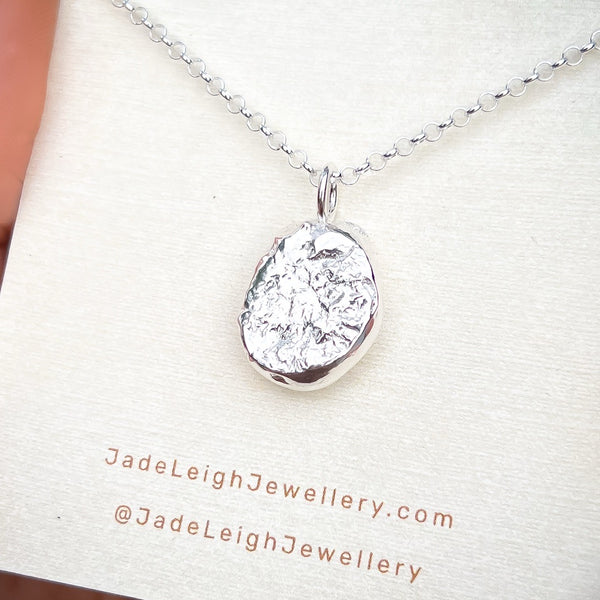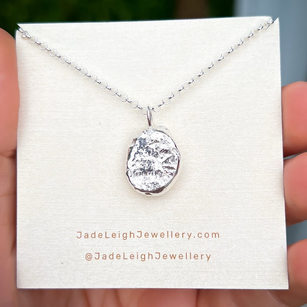 This pendant is made from recycled sterling silver and is made with a rustic textured finish.