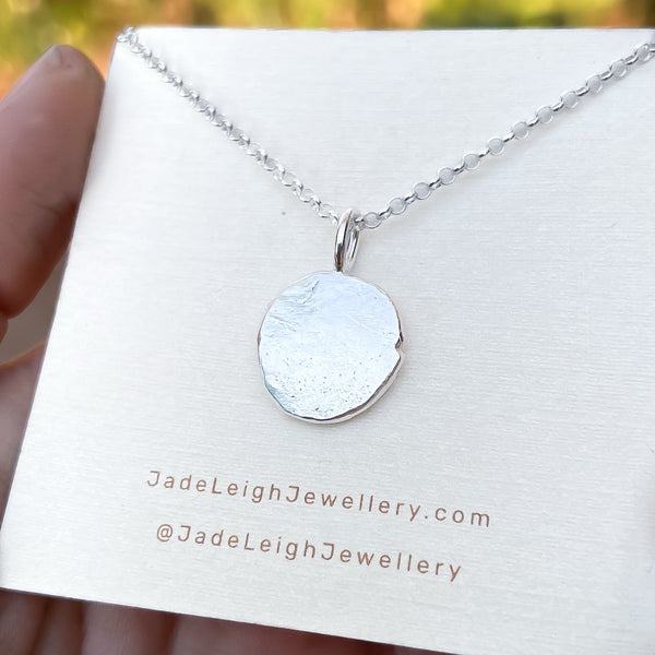 This pendant is made from recycled sterling silver and is made with a rustic textured finish.