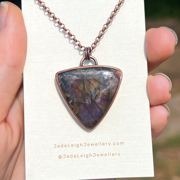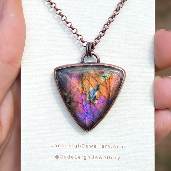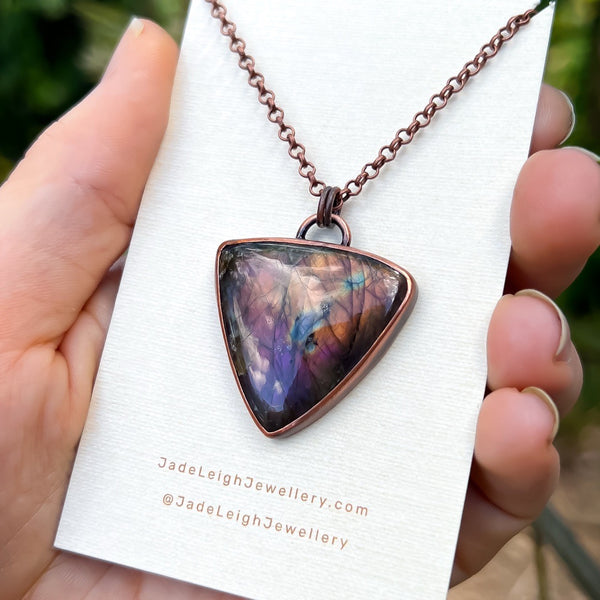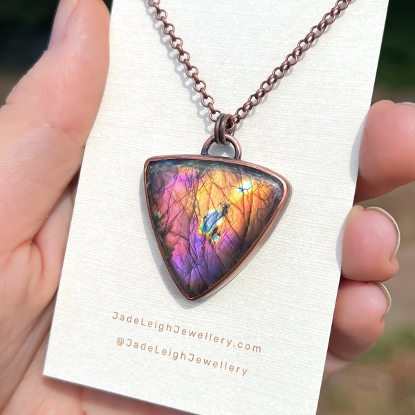 Each pendant is carefully hand forged from copper sheet. The shape is hand sawn, stone setting soldered into place, filed and sanded, coated with a patina and finally set with a labradorite stone. The pendant is then hung on a copper coated brass rolo chain.