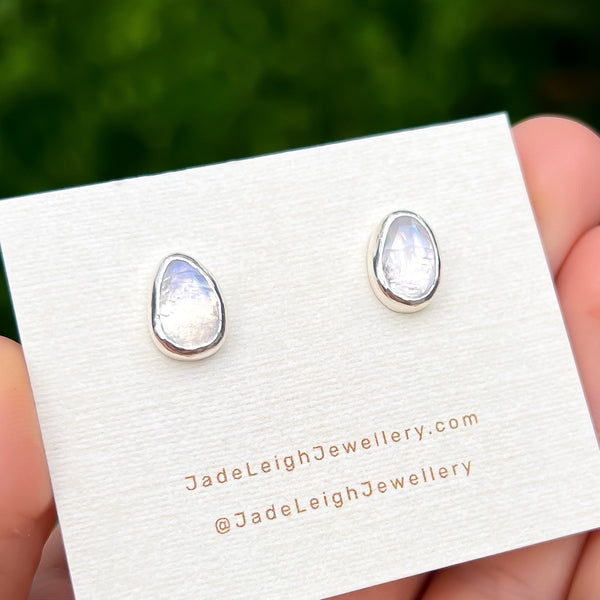 Stunning minimalist bezel set rose cut moonstone stud earrings.