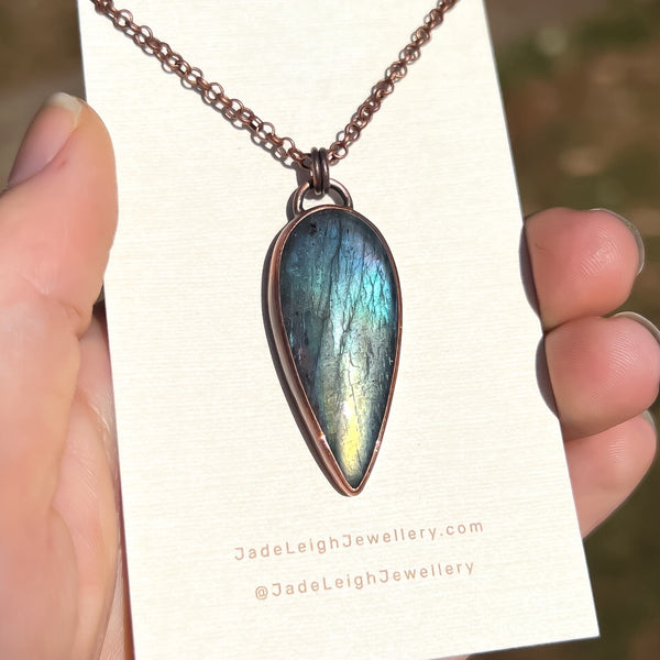Each pendant is carefully hand forged from copper sheet. The shape is hand sawn, stone setting soldered into place, filed and sanded, coated with a patina and finally set with a labradorite stone. The pendant is then hung on a copper coated brass rolo chain.