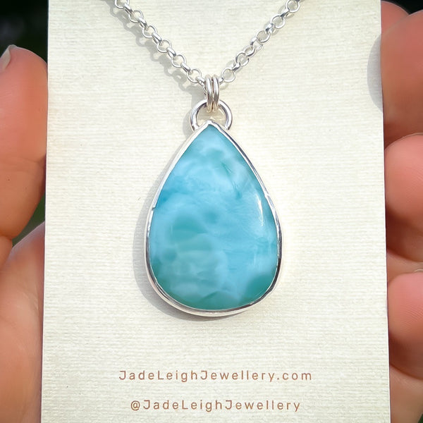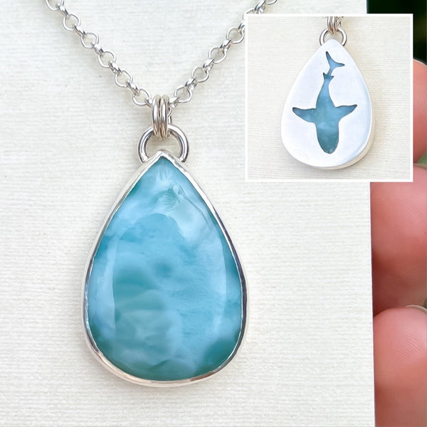 This pendant was carefully handcrafted from sterling silver sheet and wire using traditional metalsmithing techniques. Hand sawn, soldered and polished with love over many hours and set with a beautiful larimar stone.