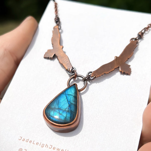 Features two wedge tailed eagles either side of a stunning blue labradorite,