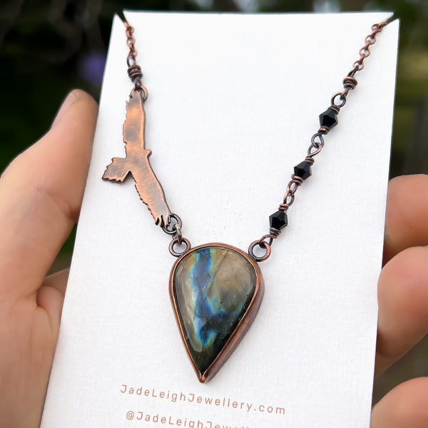 Features a wedge tailed eagle beside a labradorite, with crystal bead detail.