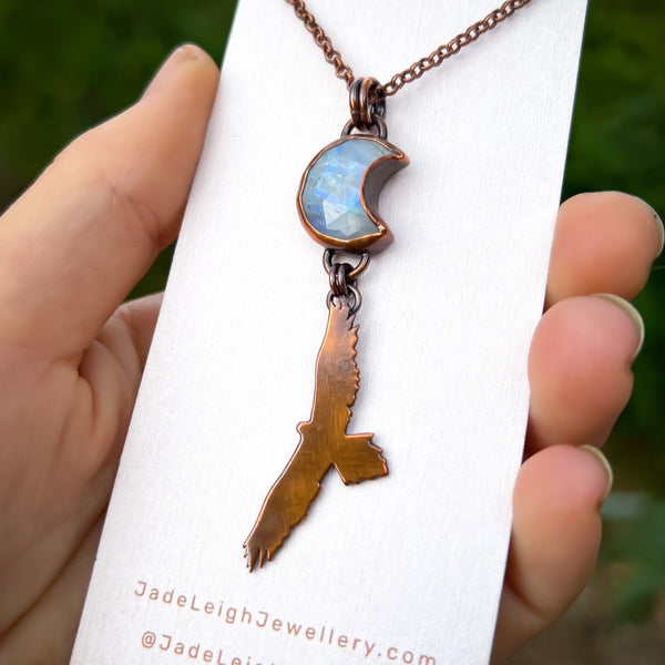 Features a wedge tailed eagle soaring below a moonstone crescent moon.